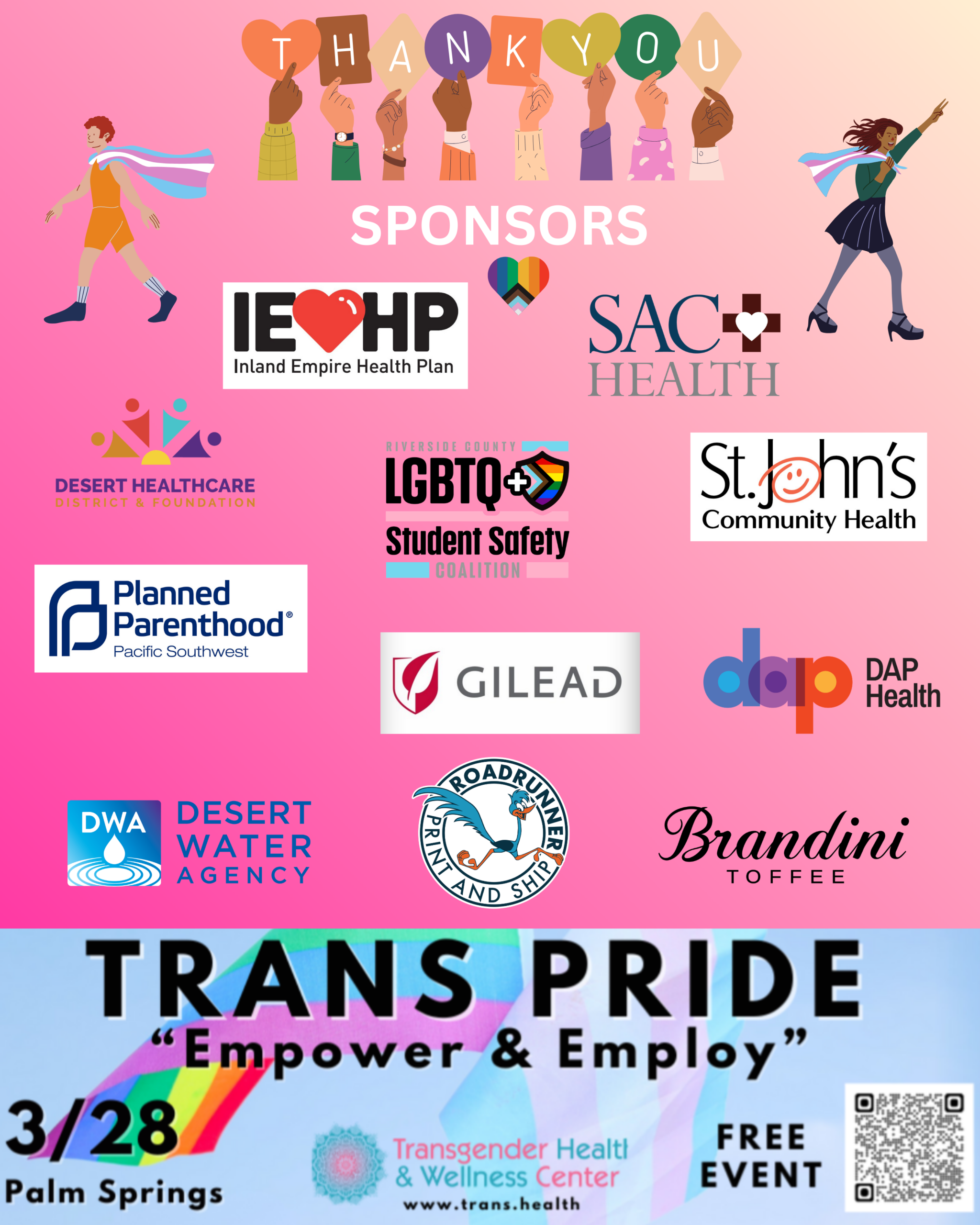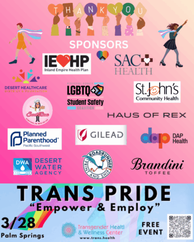 Join us at Trans Pride 2026 “Empower and Employ”! This exciting event is all about celebrating and supporting the transgender community. We’re gathering at The Palm Springs Demuth Community Center for a day filled with empowerment and employment opportunities. Come and connect with like-minded individuals, discover resources, and learn from inspiring speakers. Whether you’re looking for job opportunities or simply want to show your support, this in-person event is the perfect place to be. Let’s come together celebrate diversity, and create a more inclusive future. Expect resource booths, live drag performances, food trucks, fashion show, trans rights forum, MPJ youth space, See you there!